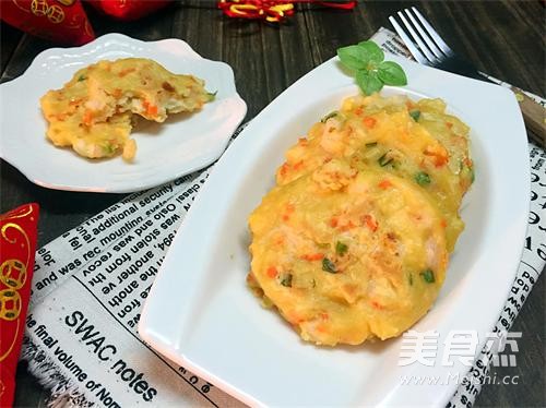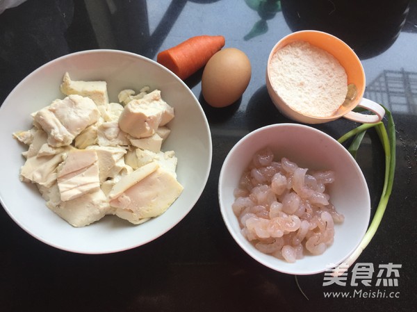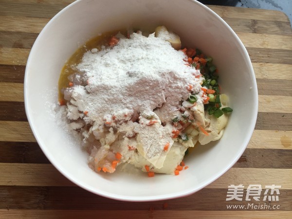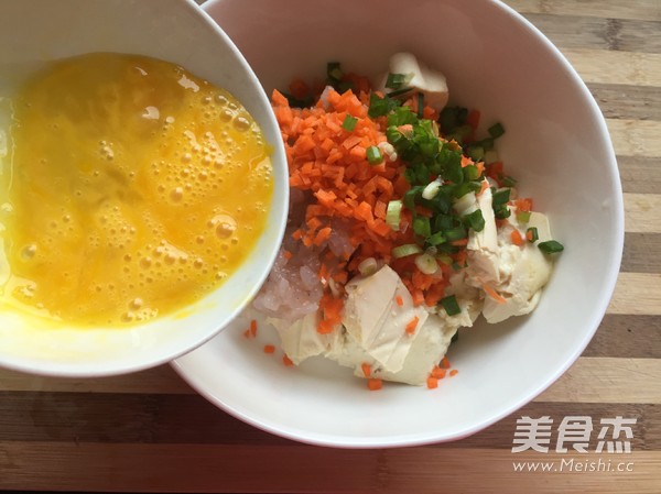 把豆腐、胡蘿卜、蝦仁、蔥放入大碗內,再倒入蛋液