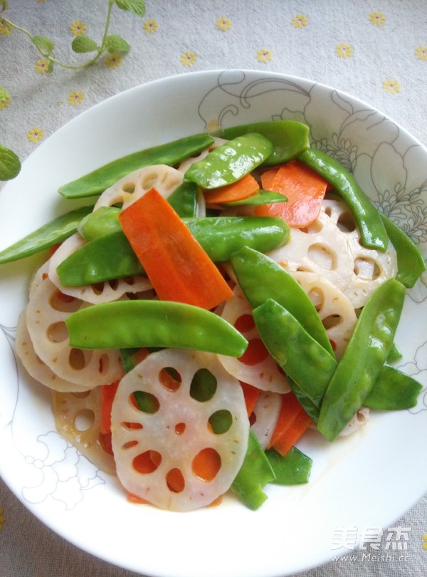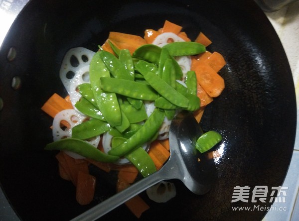 放入藕片和荷蘭豆炒勻