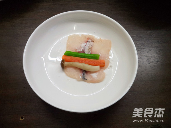 取一塊魚片,抹上少許澱粉,然後擺入配菜