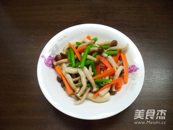 紅蘿卜、海鮮菇、冬瓜籐切段,用開水焯燙後,過涼備用,焯菜時,可在水中加入少許鹽,使之顏色更鮮艷,同時有個底味