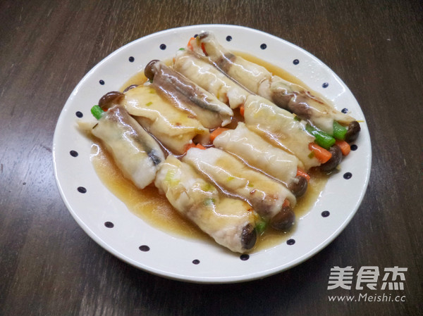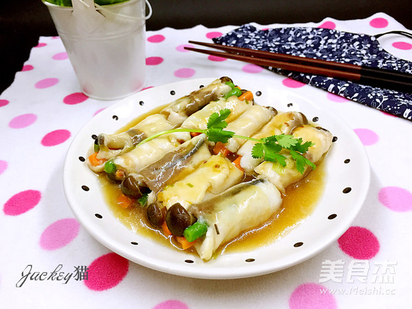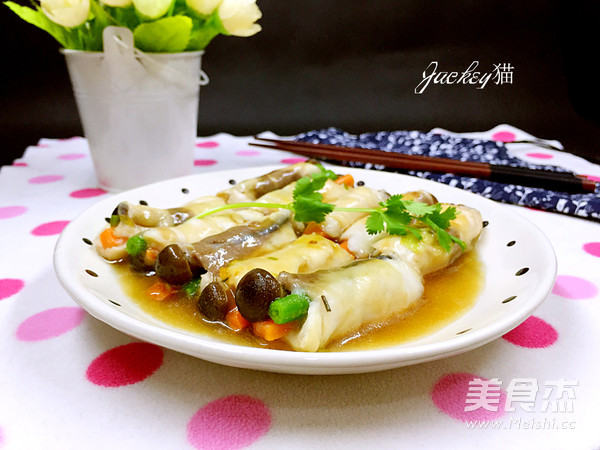 加入開水燒滾,同時調入適量生抽,蚝油等調味料,接著把魚卷放入鍋中,轉中小火煨熟後,取出裝盤