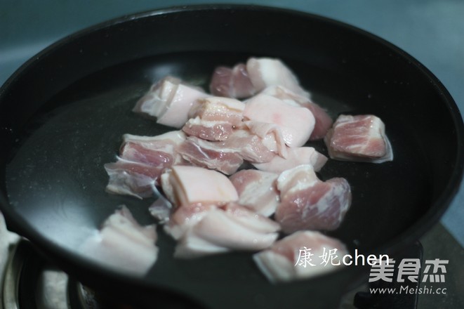 五花肉和冷水一起放進煮鍋裡,煮沸焯水,沖洗掉血沫後瀝水