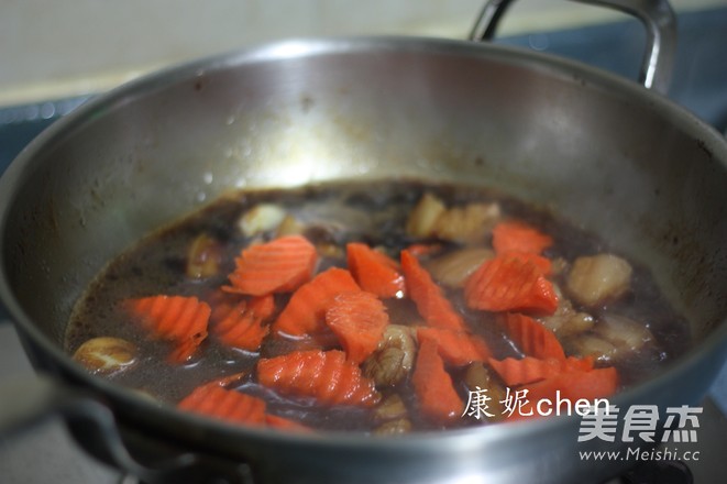 加入沒過食材的開水,再放胡蘿卜一起煮沸後用中小火焖煮