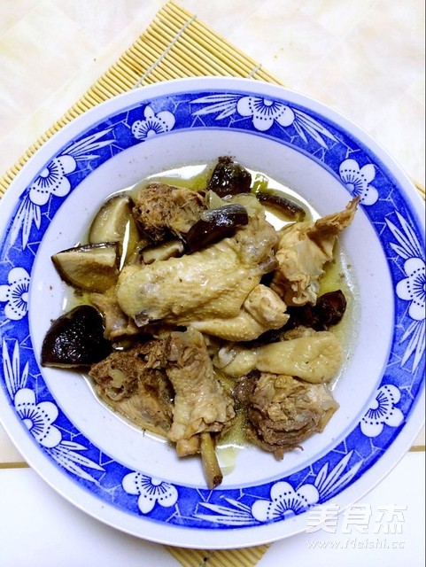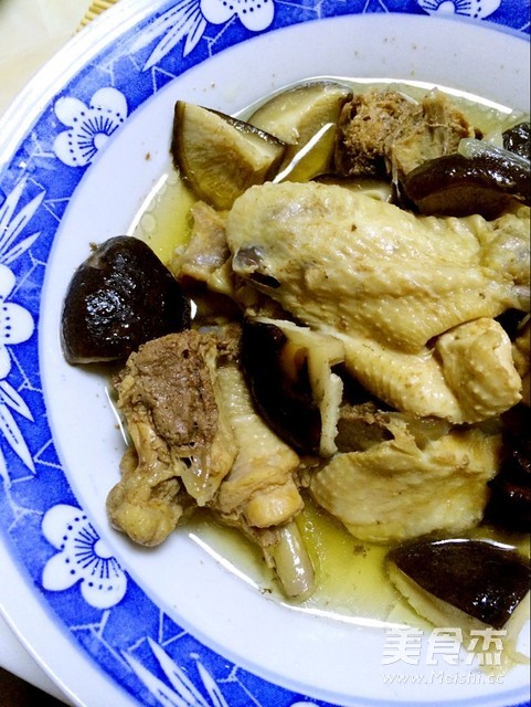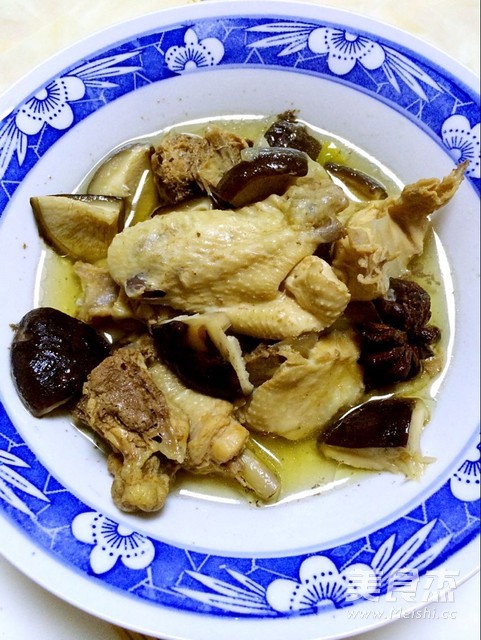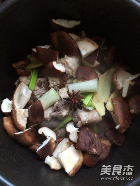 把雞、香菇、放入壓力鍋中,加入姜片,蔥段,大料,少許花椒