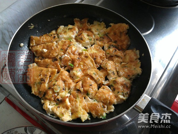 將豆腐蛋液倒入鍋中,用竹鏟攤平,