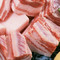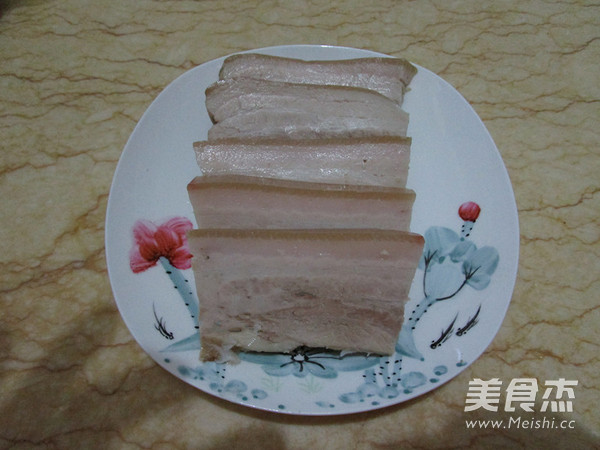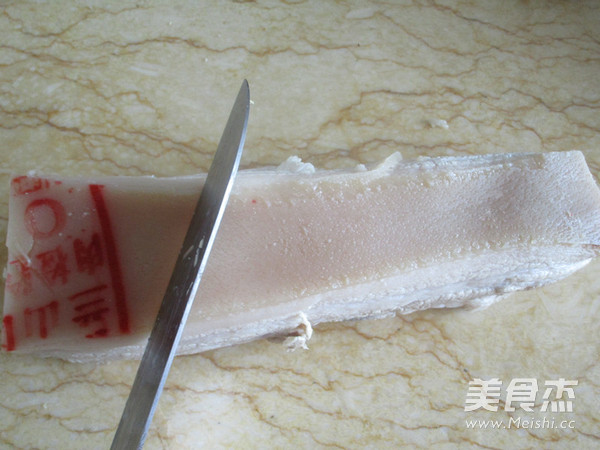 撈起後沖涼用刀使勁刮去皮表面的油脂(去除油脂的肉皮能解油膩,而且更能入味)