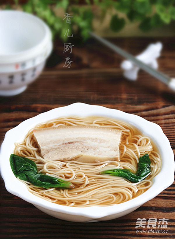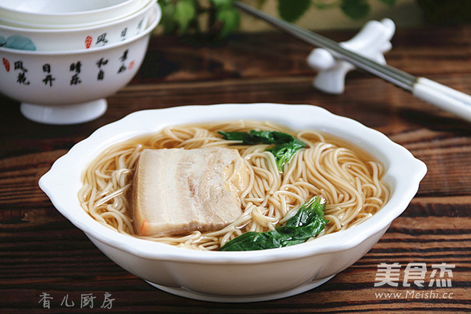 “楓鎮大肉面,面條爽滑,湯汁鮮美,最主要的亮點是面條上面的一塊大肉,看似淡淡的卻已經非常的入味,肉的口感酥而不爛,油而不膩,入口即化,確實是一碗“功夫面”。”