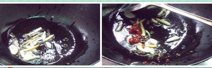 熱鍋倒油,先放入花椒、姜、蒜片煸香,再放入豆瓣醬。