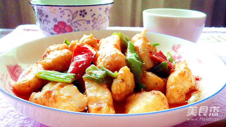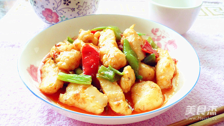 放入青、紅椒塊、蔥煸炒,最後放入魚塊炒至熟即可。