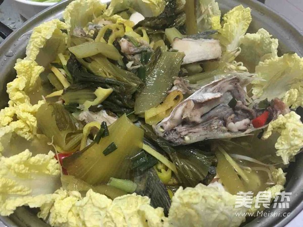 把湯汁和魚骨頭倒入白菜底盆,