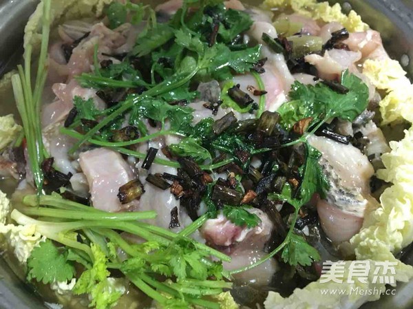 魚片分開平鋪在最上層,放點香菜