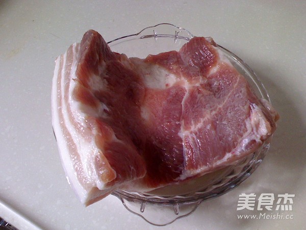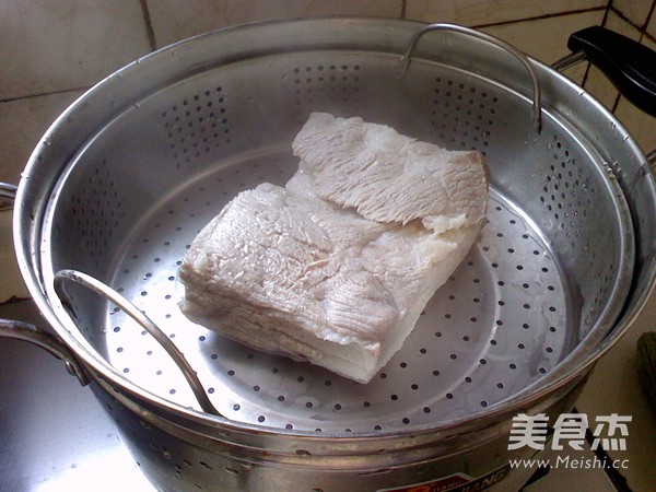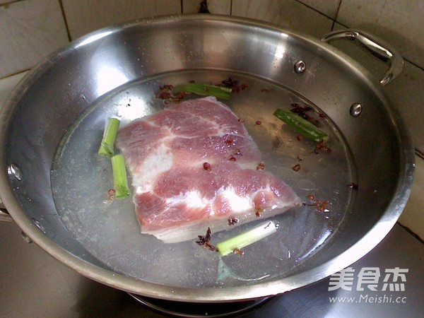 煮鍋加入花椒、八角、蔥段煮開後,把五花肉放入焯一水