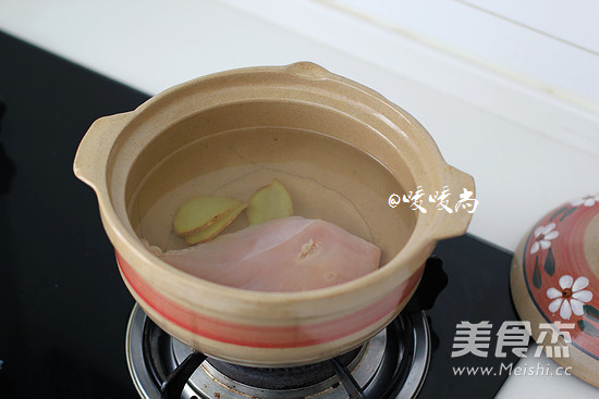 雞胸肉清洗干淨,撕去表面筋膜,加姜片冷水入鍋,大火燒開後轉小火煮20分鐘,然後關火蓋上鍋蓋焖10分鐘。