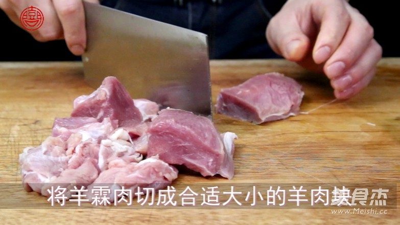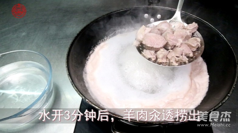 鍋裡去水,冷水時倒入羊肉塊,水開3分鐘後將羊肉汆透撈出,再洗淨血沫。