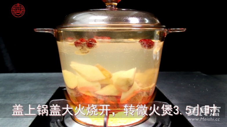 煲中一次注入足夠的水後倒入羊肉塊,倒入鐵棍山藥、生姜、紅棗、黨參、黃芪、麥冬、桂圓干,開大火,加入適量的鹽,蓋上鍋蓋大火燒開,轉微火煲3.5小時。