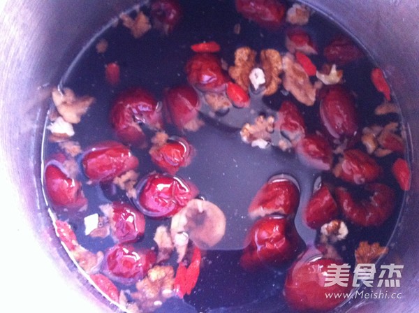 將以上食材淘洗兩遍,紅棗洗淨~去核,全部放豆漿機桶中,加水至最高水位線,按下五谷豆漿鍵即可