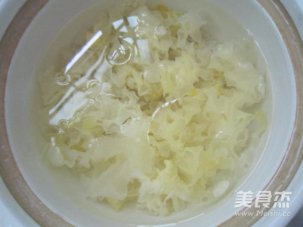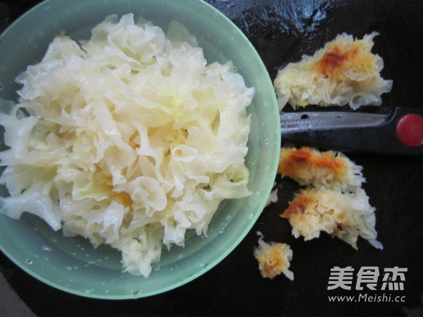 先把銀耳提前泡好,撕小朵,用剪刀剪去黃色的根