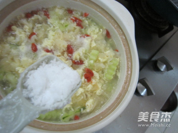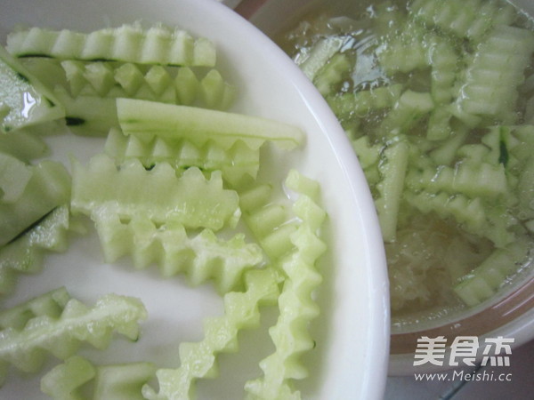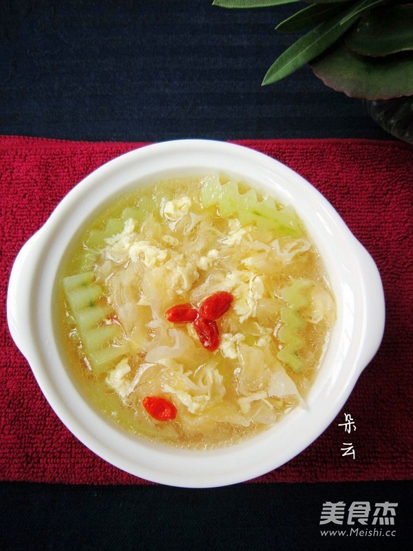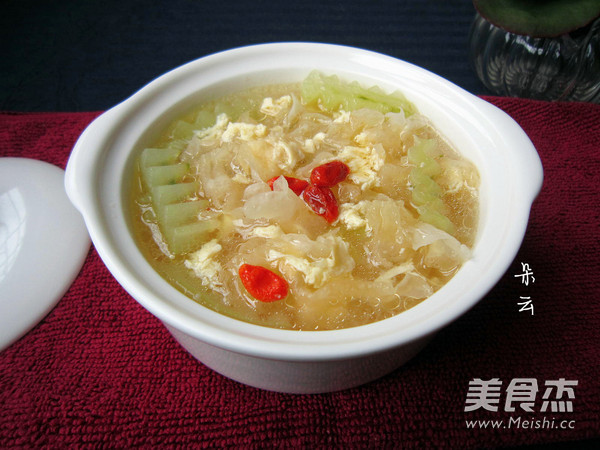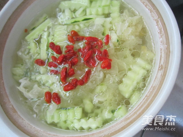 “這是一款清淡、開胃又有美容作用的湯。黃瓜有清熱、解渴、利水、消腫,抗衰老、降血糖等功效。銀耳含有一種對人體很有益處的植物膠及黏液質,不但能滋陰養顏,還能分解腸胃管道的污穢物,有清掃腸胃的功能。此外,銀耳還有豐富的磷質,有補脾健胃,清涼除燥的功用,對虛火上升、煩躁失眠,食欲不振或虛不受補的人有良好的食療效果。”