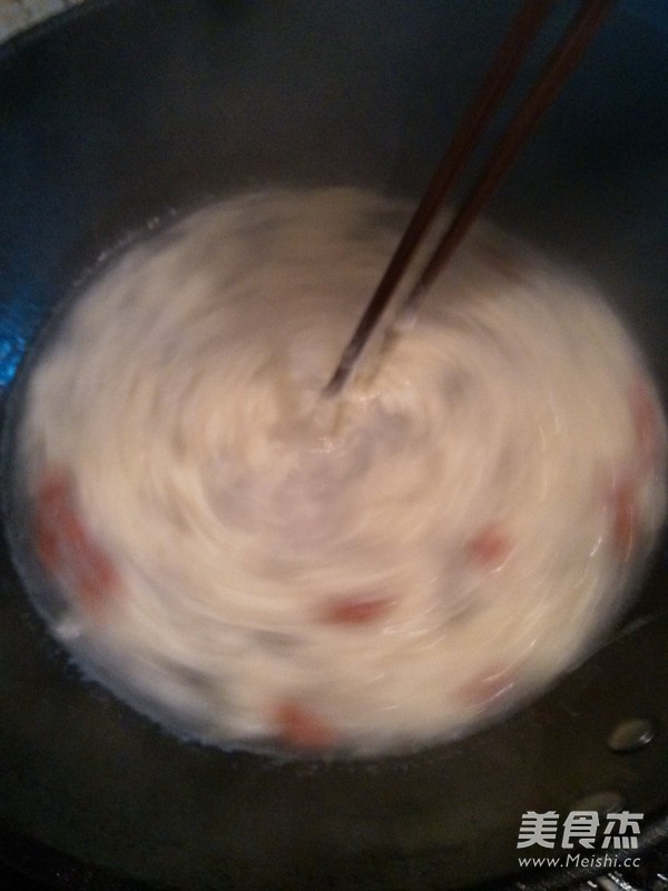 加入雞蛋液,馬上用筷子順著攪幾下,不要太用力了,攪拌的同時把火關掉,因為雞蛋用水的溫度就可以煮熟的,這樣做出來的雞蛋不會太老,而且會是一片片的哦