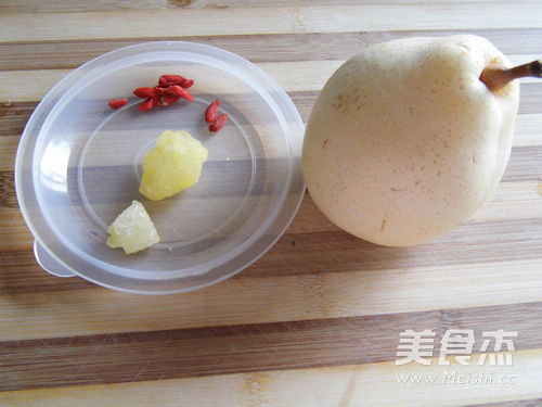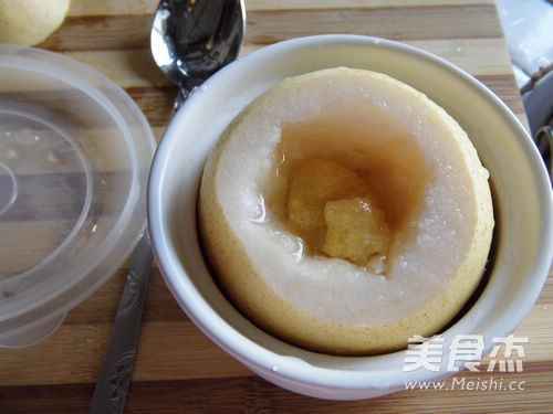 用小勺挖去梨核,把雪梨清理干淨後放入冰糖