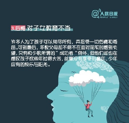 孩子是自己生命的延續、希望的延續,許多人為了孩子可以傾盡所有,並忍受一切傷痛和委屈。但望子成龍、盼女成鳳可能只是父母單方面的良好願望,對於兒女而言,他們也許只是想做一個簡單快樂的凡夫俗子。於是,許多父母采取了強制、監督甚至棍棒等方式來逼迫孩子按照自己設計的線路發展。可到最後,多數父母卻不得不在面對現實時感到失望,只有極少數所謂的“成功者”例外,但他們卻也在感歎孩子這些年過得太苦,絲毫沒有享受到童年、少年應有的快樂與陽光。